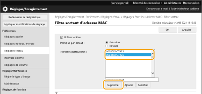 Si l'adresse MAC n'est pas correctement saisie, il est possible que vous ne puissiez pas accéder à la machine à partir de l'interface utilisateur distante. Dans ce cas, réglez <Utiliser le filtre> sur <Non> pour <Filtre sortant>/<Filtre entrant> dans <Filtre adresse MAC> à partir du panneau de commande.
