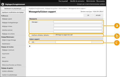 Saisissez le lien vers les informations de support de la machine à afficher sur la page du portail de l'interface utilisateur distante.