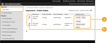 Lancez l'interface utilisateur distante  [Suivi statut/Annulation]  [Statut tâches] sous [Impression]