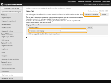 Dans [Mot de passe de décryptage], saisissez le même mot de passe que celui qui a été saisi quand les données de réglage ont été exportées.