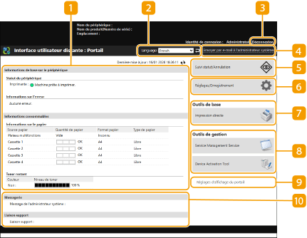 La page du portail affichée ci-dessous s'affiche quand vous vous connectez à l'interface utilisateur distante. Cette section décrit les éléments affichés sur la page du portail et les opérations basiques.