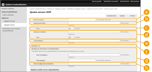 Pour spécifier un serveur Active Directory, Microsoft Entra ID ou LDAP comme dispositif d'authentification supplémentaire, vous devez enregistrer les informations du serveur utilisé pour l'authentification. Effectuez un test de connexion si nécessaire.
