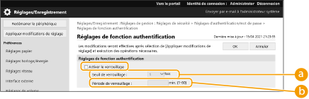 Vous pouvez définir une politique concernant le verrouillage (l'état où les utilisateurs ne peuvent pas temporairement se connecter à la machine) et l'opération/saisie du mot de passe.