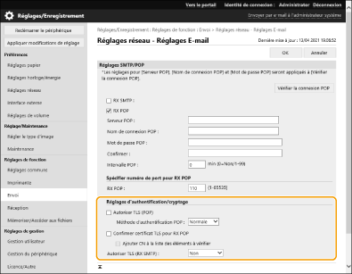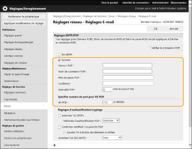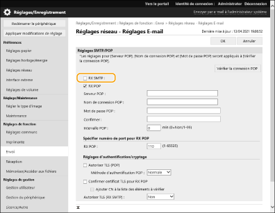 Cette section décrit comment spécifier les paramètres pour la réception et l’impression d'e-mail sur cette machine. Utilisez un ordinateur pour spécifier les réglages de réception de courriels et pour que le panneau de commande de la machine spécifie les réglages d'impression des e-mails. Les privilèges d'administrateur sont requis pour configurer ces réglages.