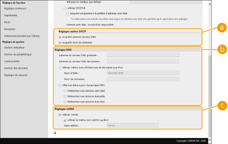 DNS (Nom de domaine Système) fournit un service pour la résolution de nom qui associe un nom d’hôte (ou domaine) avec une adresse IP. Configurez les paramètres d'option DNS, mDNS ou DHCP si nécessaire. Notez que les procédures de configuration de DNS sont différentes pour IPv4 et IPv6. Les privilèges d'administrateur sont nécessaires pour cette opération.