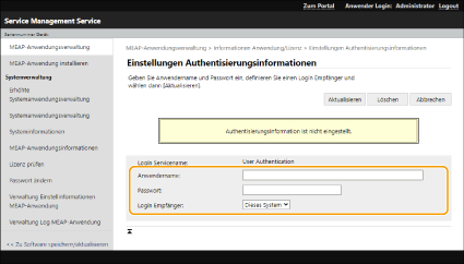 Wenn die Login-Anwendung geändert wird, bestätigen Sie die Authentifizierungsinformationen in der Datei [MEAP Authentisierung einstellen]. Gegebenenfalls ist es notwendig, die Authentifizierungsinformationen erneut einzugeben. |