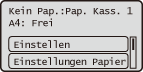Wenn das angezeigte Papierformat/der Papiertyp sich vom eingelegten Papierformat/Papiertyp unterscheidet, wählen Sie <Einstellungen Papier> und die Papierzufuhr in der das richtige Papier eingelegt ist.