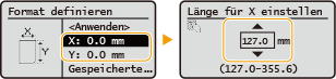 Geben Sie die Länge der Seiten <X> und <Y> ein. Wählen Sie <X> oder <Y>, um die Länge der jeweiligen Seite mit den Zahlentasten oder mit