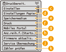<Einstellungen Funktion>, <Präferenzen> und viele andere Geräteeinstellungen beginnen mit dieser Schaltfläche.
