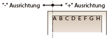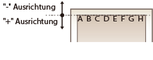 Die Druckpositionsanpassung ist erforderlich, wenn die Markierungen zur Überprüfung der Druckposition schief sind. Die Richtung der Druckposition kann mit einem positiven Wert (+) oder negativen Wert (-) angegeben werden und der Abstand kann in Millimetern festgelegt werden. Um eine vertikale Justierung durchzuführen, setzen Sie einen negativen Wert (-) fest, um die Druckposition nach oben zu verschieben, oder einen positiven Wert (+), um die Druckposition nach unten zu verschieben. Um eine horizontale Anpassung durchzuführen, setzen Sie einen negativen Wert (-) fest, um die Druckposition nach links zu verschieben, oder einen positiven Wert (+), um die Druckposition nach rechts zu verschieben.