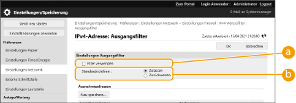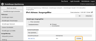 Überprüfen der blockierten Kommunikationsanfragen im ProtokollDie letzten 100 von der Firewall blockierten Kommunikationen können unter [Einstellungen/Speicherung] [Einstellungen Netzwerk] [Log gesperrte IP-Adresse] geprüft werden. Der Verlauf der blockierten Kommunikationen kann aus der Remote UI im CSV-Format exportiert werden. Exportieren eines Protokolls in eine DateiWenn [Standardrichtlinie] auf [Zurückweisen] festgelegt ist, wird der Verlauf der von der Firewall blockierten Kommunikationen nicht unter [Log gesperrte IP-Adresse] angezeigt. Zulassen oder Ablehnen des ICMP-Sendens und -EmpfangensKlicken Sie auf [Einstellungen/Speicherung] [Einstellungen Netzwerk] [IPv4-Adressfilter]/[IPv6-Adressfilter] [ ] Einstellungen ICMP Senden/Empfangen Aktivieren oder deaktivieren Sie [Senden/Empfangen über ICMP immer zulassen].Verwenden der SystemsteuerungSie können die IP-Adressenfilterung auch über <Einstellen> auf dem Bildschirm <Startseite> aktivieren oder deaktivieren. <Netzwerk> Stapelweises Importieren/stapelweises ExportierenDiese Einstellung lässt sich mit Modellen, die diesbezüglich den Stapelimport unterstützen, importieren/exportieren. Importieren/Exportieren von Einstellungsdaten Diese Einstellung ist beim Stapelexport in [Grundinformationen Einstellungen/Speicherung] enthalten. Importieren/Exportieren aller Einstellungen |