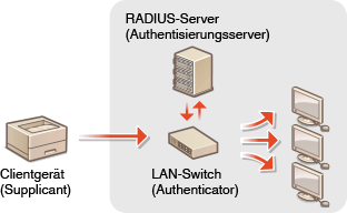 In einer Netzwerkumgebung mit IEEE 802.1X-Authentifizierung wird unbefugter Netzwerkzugriff durch einen LAN-Schalter (Authenticator) blockiert, der nur Client-Geräten (Supplicants) Zugriffsrechte gewährt, die vom Authentifizierungsserver (RADIUS-Server) autorisiert sind. Um das Gerät mit einem IEEE 802.1X-Netzwerk zu verbinden, müssen Einstellungen wie beispielsweise die Authentifizierungsmethode für den Authentifizierungsserver am Gerät konfiguriert werden. Für die Konfiguration dieser Einstellungen sind Administratorrechte erforderlich. [Einstellungen IEEE 802.1X] umfassen die Einstellungen für Haupt- und Nebenleitung. Registrieren Sie die Einstellungen nach Bedarf.