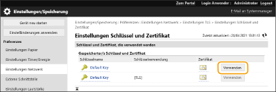 Wenn Sie einen Schlüssel und ein Zertifikat verwenden möchten, das Sie selbst generiert haben, müssen Sie den Schlüssel und das Zertifikat generieren, bevor Sie das nachfolgende Verfahren ausführen. Generieren der Schlüssel und Zertifikate für die Netzwerkkommunikation Wenn Sie einen Schlüssel und ein Zertifikat verwenden möchten, das Sie von einer Zertifizierungsstelle (CA) erwerben, müssen Sie den Schlüssel und das Zertifikat registrieren, bevor Sie das nachfolgende Verfahren ausführen. Registrieren eines Schlüssels und Zertifikats |