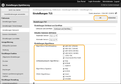Wenn Sie [Verschlüsselungsmethode für FIPS 140 formatieren] wählen, erfolgt die TLS-Kommunikationsverschlüsselungsmethode gemäß den von der Regierung der Vereinigten Staaten genehmigten FIPS (Federal Information Processing Standards) 140, aber es gelten die folgenden Einschränkungen. Es tritt ein Fehler auf, wenn Sie versuchen, ein Zertifikat für TLS festzulegen, das einen Algorithmus verwendet, der nicht von FIPS (geringer als RSA2048bit) erkannt wird. Es tritt ein Kommunikationsfehler auf, wenn das Kommunikationsziel keine FIPS anerkannte Verschlüsselungsalgorithmen unterstützt. [CHACHA20-POLY1305] und [X25519] können nicht mehr verwendet werden. Stapelweises Importieren/stapelweises ExportierenDiese Einstellung lässt sich mit Modellen, die diesbezüglich den Stapelimport unterstützen, importieren/exportieren. Importieren/Exportieren von Einstellungsdaten Diese Einstellung ist beim Stapelexport in [Grundinformationen Einstellungen/Speicherung] enthalten. Importieren/Exportieren aller Einstellungen |