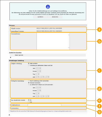 [Zeitplan Verteilung]Um die Firmware sofort herunterzuladen, wählen Sie [Jetzt verteilen]. Um die Firmware an einem bestimmten Datum zu einer bestimmten Uhrzeit automatisch herunterzuladen, wählen Sie [Verteilung zu definierten Datum und Zeit], und legen Sie das Datum und die Uhrzeit in [Jahr:]/[Monat:]/[Tag:]/[Zeit:] fest. Sie können die Zeit eine Woche im Voraus planen.
