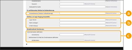 4 | Geben Sie an, wie Attributnamen und Domainname festzulegen sind. ![]() [Anwendername (Tastatur-Authentisierung):]Legen Sie das LDAP-Datenfeld (Attributname) für den Benutzernamen auf dem LDAP-Server fest (Beispiel: uid). [Login-Name:] / [Name anzeigen:] / [E-Mail-Adresse:]Legen Sie die LDAP-Datenfelder (Attributnamen) für den Anmeldenamen, Anzeigenamen und die E-Mail-Adresse des jeweiligen Benutzerkontos auf dem LDAP-Server fest (Beispiel: uid, cn, mail). [Domännamen definieren] / [Attributname für Erhalt des Domännamens definieren]Wählen Sie, wie der Domänenname des Anmeldeziels festgelegt werden soll. Um den Domänennamen direkt festzulegen, wählen Sie [Domännamen definieren], und geben Sie den Domänennamen ein. Um ein LDAP-Datenfeld (Attributname) festzulegen, aus dem der Domänenname auf dem LDAP-Server bezogen wird, wählen Sie [Attributname für Erhalt des Domännamens definieren], und geben Sie dann den Attributnamen ein (Beispiel: dc). |