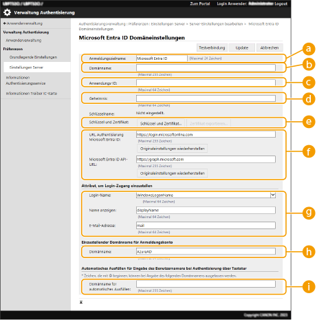 2 | Geben Sie die erforderlichen Informationen ein. ![]() [Anmeldungszielname:]Geben Sie den Anzeigenamen für das Anmeldeziel ein. Standardwert: Microsoft Entra ID [Domänname:]Geben Sie den Domänennamen von Microsoft Entra ID ein, der das Anmeldeziel ist. [Anwendungs ID:]Geben Sie die Anwendungs-ID (Client) ein. [Geheimnis:]Geben Sie das in Microsoft Entra ID ausgegebene Geheimnis ein. Wenn Sie [Schlüssel und Zertifikat] verwenden, ist hier keine Eingabe erforderlich. [Schlüssel und Zertifikat]Klicken Sie auf [Schlüssel und Zertifikat], wenn Sie einen Schlüssel und ein Zertifikat verwenden. Durch Klicken auf [Zertifikat exportieren] können Sie das in Microsoft Entra ID registrierte Zertifikat exportieren. [URL Authentisierung Microsoft Entra ID] / [Microsoft Entra ID API-URL] Geben Sie die URL ein. Abhängig von Ihrer Cloud-Umgebung müssen Sie die URL möglicherweise modifizieren. Klicken Sie auf [Originaleinstellungen wiederherstellen], um die URL von [URL Authentisierung Microsoft Entra ID] / [Microsoft Entra ID API-URL] auf den Standardwert zurückzusetzen. Standardwert: [URL Authentisierung Microsoft Entra ID]: https://login.microsoftonline.com [Microsoft Entra ID API-URL]: https://graph.microsoft.com [Login-Name:] / [Name anzeigen:] / [E-Mail-Adresse:] Geben Sie die Datenfeldnamen (Attributnamen) ein, für die ein Anmeldename, Anzeigename und eine E-Mail-Adresse jedes Benutzerkontos auf einem Microsoft Entra ID-Server registriert sind. Standardwert: WindowsLogonName, displayName, mail Beispiel: userPrincipalName, displayName, mail [Domänname:] In den meisten Fällen müssen Sie die Einstellung nicht ändern. Standardwert: AzureAD [Domänname für automatisches Ausfüllen:] Geben Sie den Domännamen ein, der automatisch eingegeben wird. Sie müssen den Domännamen nach @ nicht selbst eingeben. |
