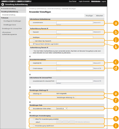 dc | Nein | 0 bis 32 Zeichen | Kontrollzeichen | - (N/A) | Kann nicht geändert werden. Wird den folgenden Benutzern automatisch zugewiesen. Nach Server-Authentifizierung registrierte Benutzer |