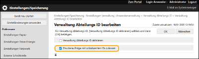 Aktivieren Sie dieses Kontrollkästchen, um Druckaufträge von Druckertreibern zu akzeptieren, die die Abteilungs-ID-Verwaltung nicht unterstützen.
