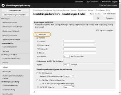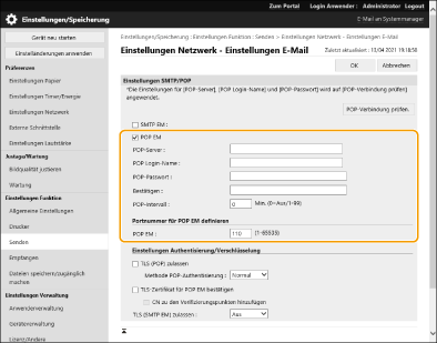 Aktivieren Sie das Kontrollkästchen, um E-Mail-Druck über POP-Mailserver zu aktivieren. Sie können diese Einstellung auch mit <POP EM verw.> im Einstellungsmenü des Bedienfelds festlegen.