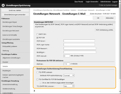 Wählen Sie [Immer TLS] oder [Ein], um die Kommunikation mit TLS zu verschlüsseln, wenn Sie E-Mails oder I-Faxe über die SMTP-Serverfunktion empfangen.