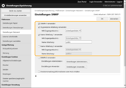 Das Simple Network Management Protocol (SNMP) ist ein Protokoll zur Überwachung und Steuerung von Kommunikationsgeräten in einem Netzwerk mithilfe der Management Information Base (MIB). Das Gerät unterstützt SNMPv1 und das sicherheitsverbesserte SNMPv3. Sie können den Gerätestatus von einem Computer aus überprüfen, wenn Sie Dokumente drucken oder Remote UI verwenden. Sie können entweder SNMPv1 oder SNMPv3 oder beide gleichzeitig aktivieren. Legen Sie die Einstellungen für jede Version so fest, dass sie zu Ihrer Netzwerkumgebung und dem Verwendungszweck passen.