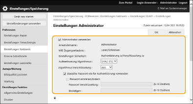 1 | Klicken Sie auf [Einstellungen Administrator]. [Administrator verwenden ]Aktivieren Sie das Kontrollkästchen, um den Administratorbenutzer zu verwenden. [Authentisierung Algorithmus] und [Algorithmus Verschlüsselung] können nicht geändert werden. [Dasselbe Passwort wie für Authentisierung verwenden] Aktivieren Sie das Kontrollkästchen, um das gleiche Passwort wie bei der Benutzerauthentifizierung zu verwenden. |