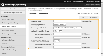 [Einstellungen Sicherheit] Wählen Sie [Authentisierung Ja/Verschlüsselung Ja], [Authentisierung Ja/Verschlüsselung Nein] oder [Authentisierung Nein/Verschlüsselung Nein] für die gewünschte Kombination aus Authentifizierungs- und Verschlüsselungseinstellungen. [Authentisierung Algorithmus] Wählen Sie [MD5], [SHA1] oder [SHA2] gemäß Ihrer Umgebung aus. Wählen Sie für [SHA2] aus vier Hash-Längen (224 Bit, 256 Bit, 384 Bit oder 512 Bit). [Algorithmus Verschlüsselung] Wenn Sie [Authentisierung Ja/Verschlüsselung Ja] unter [Einstellungen Sicherheit] ausgewählt haben, wählen Sie den passenden Verschlüsselungsalgorithmus für Ihre Netzwerkumgebung. [Authentisierungspasswort]/[Passwort Verschlüsselung] Verwenden Sie alphanumerische Zeichen zur Passworteingabe unter [Authentisierungspasswort] oder sowohl [Passwort Verschlüsselung] als auch [Bestätigen], je nach den Einstellungen unter [Einstellungen Sicherheit]. Legen Sie dies für jeden Algorithmus (Authentifizierung/Verschlüsselung) fest. |