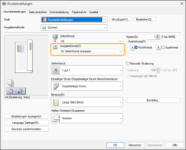 Passen Sie [Ausgabeformat] im Druckertreiber an das Format an, auf das Sie drucken möchten.