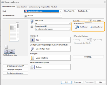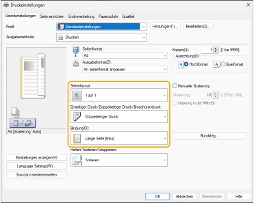 3 | Überprüfen Sie die Druckvorschau, und stellen Sie [Seitenlayout] [Seitenfolge] [Einseitiger Druck/Doppelseitiger Druck/Broschürendruck] [Bindung] ein. |