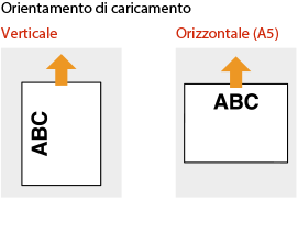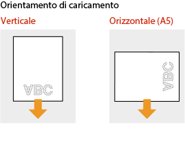 Il metodo di caricamento varia a seconda che la carta con il logo abbia un orientamento orizzontale o verticale. Caricare la carta con il logo (il lato da stampare) verso il basso, come illustrato nelle seguenti figure.