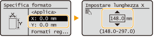 | Selezionare <X> o <Y> per specificare la lunghezza di ciascun lato usando i tasti numerici o  /  . |