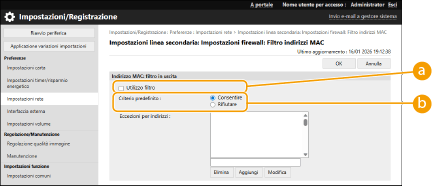 Se gli indirizzi MAC sono immessi in modo non corretto, potrebbe non essere possibile accedere alla macchina dalla IU remota; in questo caso è necessario impostare <Filtro indirizzi MAC> su <Off>. <Rete>