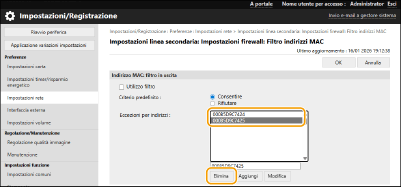 Se l’indirizzo MAC non è stato immesso correttamente, potrebbe non essere possibile accedere alla macchina dall’IU remota. In questo caso, impostare <Utilizzo filtro> su <Off> per <Filtro in uscita>/<Filtro in ingresso> in <Filtro indirizzi MAC> dal pannello di controllo.