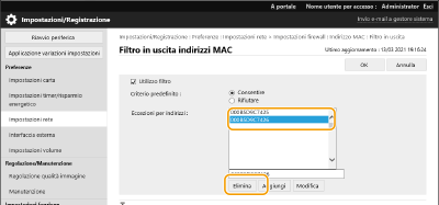 [Filtro in uscita] o [Filtro in ingresso] per [Filtro indirizzi MAC].