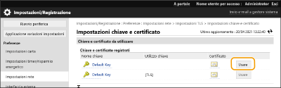 Fare clic su [Usare] per la chiave e il certificato da utilizzare per la comunicazione crittografata TLS.