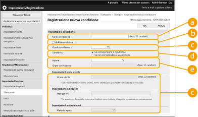 Si possono impostare condizioni dettagliate per trattenere i lavori di stampa, come l'indirizzo utente o IP. Se non vengono impostate condizioni, vengono trattenuti tutti i lavori di stampa, tranne quelli provenienti da utenti non identificati. Se non vengono impostate condizioni e si riceve un lavoro di stampa da un utente non identificato, questo verrà annullato senza essere trattenuto.
