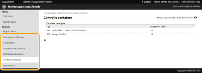 È possibile verificare un gran numero di informazioni sulla macchina, ad esempio informazioni sugli errori, quantità di carta e toner rimanenti, informazioni sulle apparecchiature opzionali collegate e numero totale di pagine che sono state stampate finora.