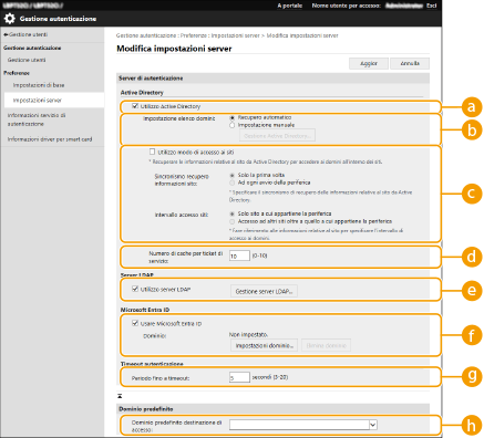 ![]() | Per specificare una Active Directory, Microsoft Entra ID o un server LDAP come dispositivo di autenticazione aggiuntivo, è necessario registrare le informazioni del server utilizzate per l'autenticazione. Se necessario, eseguire un test di connessione. |