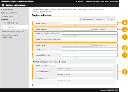 4 | Inserire le informazioni necessarie. ![]() [Nome dominio:]Inserire il nome di dominio della Directory Attiva corrispondente alla destinazione di accesso (esempio: azienda.dominio.com). [Nome NetBIOS]Inserire il nome di dominio NetBIOS (esempio: azienda). [Nome host primario o indirizzo IP:] / [Nome host secondario o indirizzo IP:]Inserire il nome host del server di Active Directory o l'indirizzo IPv4. Quando si utilizza un server secondario, specificare il nome in [Nome host secondario o indirizzo IP:]. Esempio: Uso di un nome host: ad-server1 Uso di un indirizzo IPv4: 192.168.18.138 [Nome utente:] / [Password:]Inserire il nome utente e la password da utilizzare per accedere e cercare il server Directory Attiva. [Punto di inizio ricerca:]Specificare la posizione di accesso e ricerca nel server di Active Directory. [Nome di accesso:] / [Visualizzato come] / [Indirizzo e-mail:]Specificare i campi dei dati (nomi attributo) per il nome di accesso, il nome di visualizzazione e l'indirizzo e-mail di ciascun account utente sul server Directory Attiva (esempio: sAMAccountName, cn, mail). |