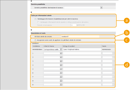 [Stringa di caratteri] | Inserire la stringa di caratteri registrata nell'attributo specificato in [Attributo utente da cercare:]. Per impostare i privilegi basati sul gruppo a cui appartiene l'utente, inserire il nome del gruppo. |