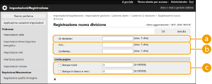 La Gestione ID divisione è valida solamente per gli utenti registrati sul dispositivo locale. Se si effettua l'accesso come utente con privilegi di amministratore gli ID e PIN del Manager di sistema vengono assegnati automaticamente e gestiti come ID divisione. |