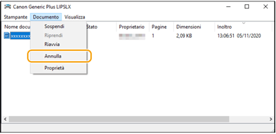 Se non è possibile trovare il documento da annullare, il documento è già stato inviato alla macchina. In tal caso, non è possibile annullare la stampa sul computer.