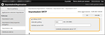 È possibile verificare lo stato di comunicazione tra la macchina e il server registrato usando l'SNTP. Tuttavia, viene confermato solo lo stato di comunicazione, ma non viene effettuata la regolazione dell'ora.