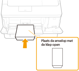 Plaats enveloppen in de papierlade of in de papiertafel. Voorkom bij het afdrukken van enveloppen papierstoringen en kreukels door eventuele krullen glad te strijken voor het plaatsen. Let ook op de invoerrichting van de enveloppen en welke kant naar boven wijst. Let op: enveloppen noch briefkaarten kunnen in de papierlade worden geladen.
