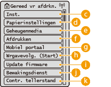 <Functie-instellingen>, <Voorkeuren>, en vele andere instellingen van het apparaat zijn toegankelijk met deze knop.