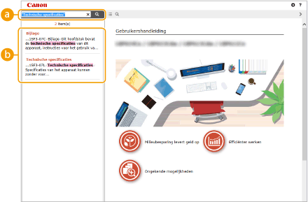 Geeft de zoekresultaten weer van de pagina's die de opgegeven trefwoorden bevatten. Zoek in de resultaten naar de gewenste pagina en klik op de onderwerptitel van de pagina.
