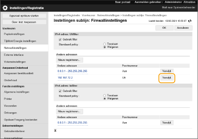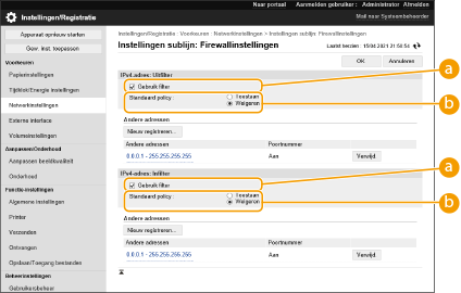 De geblokkeerde communicatieverzoeken in het logboek controlerenDe laatste 100 communicaties die door de firewall werden geblokkeerd, kunnen worden gecontroleerd in [Instellingen/Registratie] [Netwerkinstellingen] [IP-adresblok log]. De geschiedenis met geblokkeerde communicaties kan in de CSV-indeling worden geëxporteerd vanuit de Remote UI (UI op afstand). Een logboek als een bestand exporterenAls [Standaard policy] is ingesteld op [Weigeren], wordt de communicatiegeschiedenis die geblokkeerd wordt door de firewall niet weergegeven in [IP-adresblok log]. Gebruik van het bedieningspaneelU kunt ook de IP-adresfiltering inschakelen of uitschakelen via <Inst.> in het scherm <Home>. <Netwerk> Importeren/exporteren in batchDeze instelling kan worden geïmporteerd/geëxporteerd met modellen die ondersteuning bieden voor het importeren in batch van deze instelling. De gegevens van instellingen importeren/exporteren Deze instelling is opgenomen in [Basisinformatie instellingen/registratie] bij het exporteren van batches. Alle instellingen importeren/exporteren |