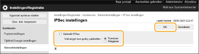 IPSec-beleidsregels beherenU kunt beleidsregels bewerken op het scherm dat bij stap 4 wordt weergegeven. Om de details van een beleid te bewerken, klik op de beleidsnaam uit de lijst. Om een beleid uit te schakelen, klikt u op de beleidsnaam in de lijst en selecteert u [Uit] bij [Policy Aan/Uit] klikt u op [OK].Om een beleid te verwijderen, selecteert u het beleid in de lijst en klikt u op [Verwijderen] [OK].Gebruik van het bedieningspaneelU kunt ook de IPSec-communicatie inschakelen of uitschakelen via <Inst.> in het scherm <Home>. <IPSec instellingen> Importeren/exporteren in batchDeze instelling kan worden geïmporteerd/geëxporteerd met modellen die ondersteuning bieden voor het importeren in batch van deze instelling. De gegevens van instellingen importeren/exporteren Deze instelling is opgenomen in [Basisinformatie instellingen/registratie] bij het exporteren van batches. Alle instellingen importeren/exporteren |