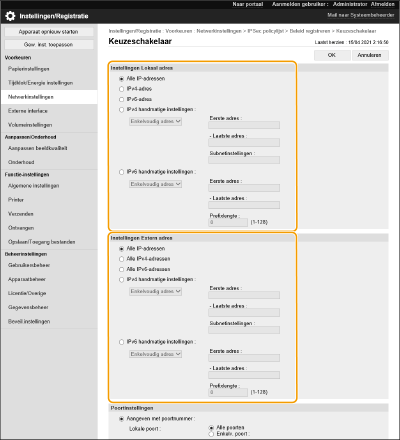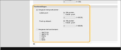 3 | Geef de poort waarop u IPSec wilt toepassen, op. ![]() Druk op [Aangeven met poortnummer] om poortnummers te gebruiken bij het opgeven van de poorten waarop IPSec van toepassing is. Selecteer [Alle poorten] om IPSec op alle poortnummers toe te passen. Om IPSec op een specifiek poortnummer toe te passen, drukt u op [Enkelv. poort] en voert u het poortnummer in. Geef de poort van deze machine op bij [Lokale poort] en van de communicatie-evenknie bij [Poort op afstand]. Als u de poorten wilt opgeven waarop IPSec op servicenaam moet worden toegepast, selecteert u [Aangeven met servicenaam] en selecteert u de te gebruiken diensten. | ||||||||||||||